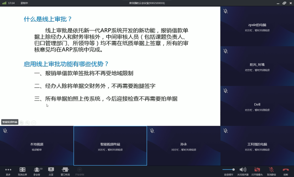 财务计划处席自强介绍了研究所近期准备上线的财务管理信息化系统。为不断提高研究所财务管理信息化程度,财务计划处优化升级研究所财务管理信息化系统,于近日正式上线运行银企互联系统,实现从财务审核到付款接近“零时差”,大幅提高了工作效率,改善了科研人员报账感受。同时,财务计划处还不断优化劳务费计税系统,准备上线“智能公务之家”APP和实现线上审批功能。“智能公务之家”集订机票、订酒店和关联ARP系统报销于一体,集中解决了差旅费报销中一系列不便,还可解决学生无法购买公务机票、重复购买航空意外险等问题。