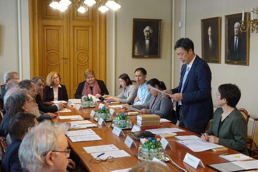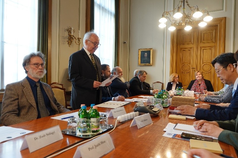 Ferenc Hudecz教授首先代表匈牙利科学院欢迎陈发虎院士一行到来。他表示,经过双方长期努力,匈牙利科学院与中国科学院在物理学、生命科学、生物多样性研究方面的合作取得了丰硕成果。匈牙利作为连接欧洲和亚洲的重要枢纽,他非常期待在丝绸之路跨学科研究方向加强与中方的合作与交流,使匈牙利成为丝绸之路上环境变化与文明演化研究的重镇。陈发虎院士作为跨大陆交流与丝路文明联盟(ATES)主席及“一带一路”国际科学组织联盟(ANSO)秘书处首任执行主任,感谢匈牙利科学院对ATES和ANSO的一贯支持。