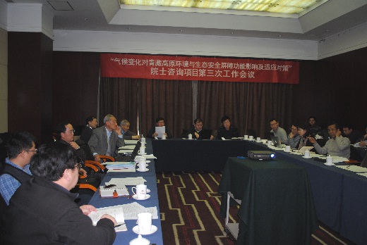 2013年2月26日,由中国科学院学部支持,依托青藏高原所和中国青藏高原研究会开展的“气候变化对青藏高原环境与生态安全屏障功能影响及适应对策”院士咨询项目第三次工作会议在北京西藏大厦举行。会议由孙鸿烈院士主持,吴国雄院士、冯宗炜院士、郑度院士、姚檀栋院士等出席会议,来自青藏高原所、地理资源所、寒旱所、成都山地所、生态中心、对地观测中心等单位的20余位专家学者参加会议。