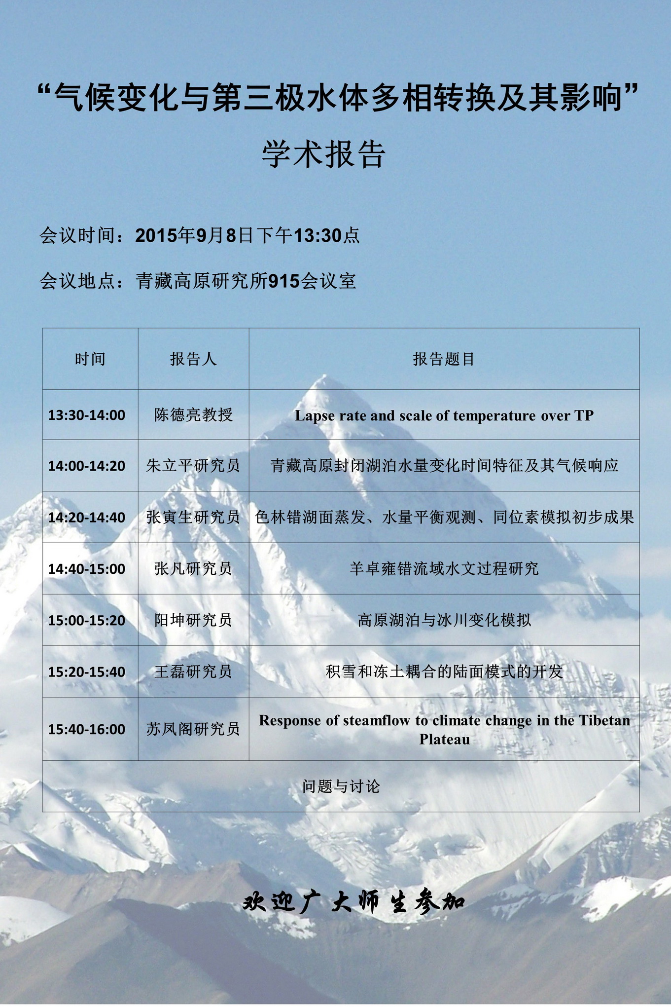 “气候变化与第三极水体多相转换及其影响”学术报告通知