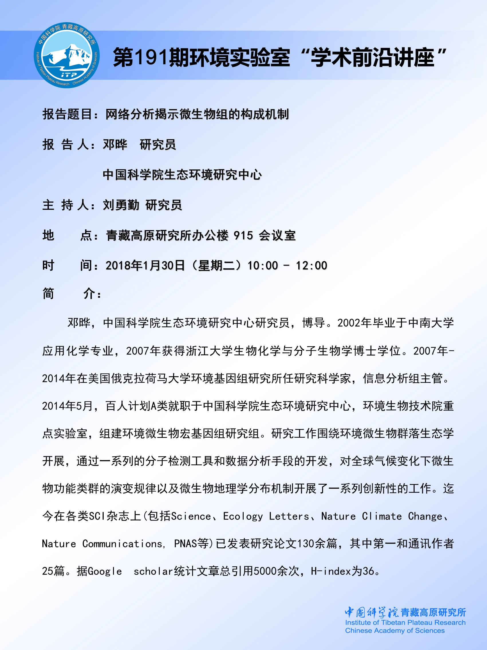 第191期环境实验室“学术前沿讲座”
