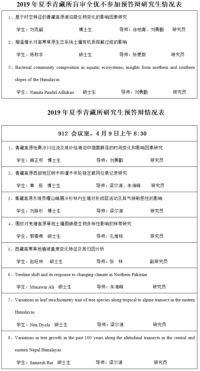 生态组,定于4月9日(周二)进行2019年夏季毕业学生预答辩。参加学生需现场 PPT 汇报(每人20分钟),专家提问10分钟。