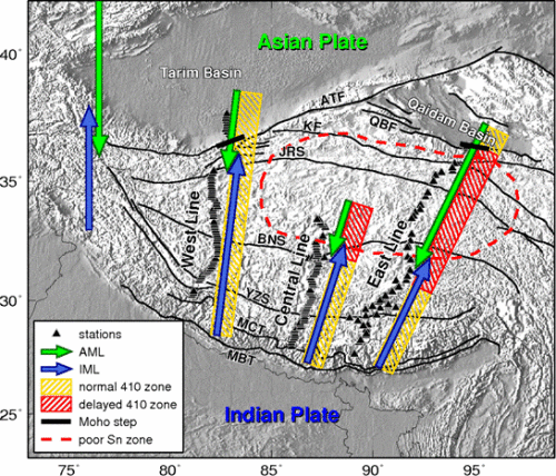 西线和中线是最近完成的青藏高原所羚羊计划-I和羚羊计划-II测线,东线是由两期法国观测项目、INDEPTH 剖面和PASSCAL项目(1991-1992)编辑而成。天山-卡拉库姆剖面是另外的一条剖面。MBT: 主边界逆冲断裂MCT: 主中央逆冲断裂;YZS: 雅鲁藏布江缝合线;BNS: 班公-怒江缝合线;JRS:金沙江缝合线; ATF: 阿尔金断裂;QBF: 柴达木盆地断裂;带有箭头的蓝色与绿色的线分别标志着所观测到的印度和亚洲板块的岩石圈和软流圈的边界(LAB),黄色和红色的方框表示所观测到的上地幔间断面,其中红色部分表示来自410KM的转换震相到时非常晚;在青藏高原北缘和西缘的黑色的短线(见西线和东线)表示此处莫霍面的深度发生明显变化。红色的虚线表示Sn波的强烈衰减区域。