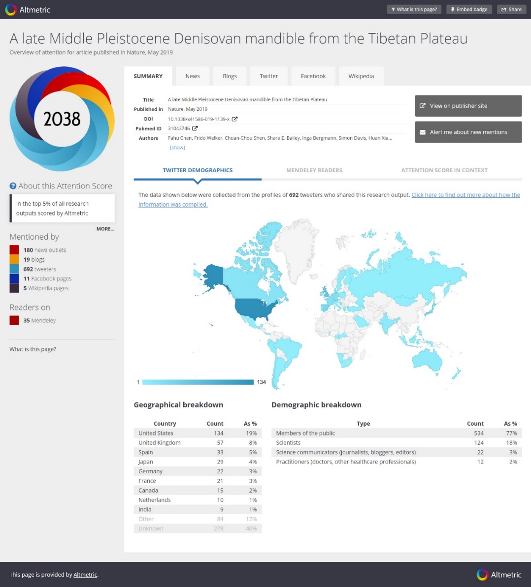 夏河人化石文章2019年5月14日Altmetric评分及Twitter用户全球关注度分布(部分地区由于语言问题数据缺少,特别是中国) 截至5月14日,夏河人化石文章在线发表近两周,其社会影响仍在被持续关注。该文的发表,不单是将青藏高原丹尼索瓦人化石的发现公布于世,而更重要的是给大家提供了更广阔的想象空间,如先于我们现代智人之前的丹尼索瓦古老型智人的生存区域和生存环境,东亚直立人、东亚古老型智人、丹尼索瓦人与我们东亚现代智人间的演化关系,以及史前人类定居青藏高原的历史和动力等问题。相比于已知的成果,大家更为期待夏河人化石的后续研究,特别是其遗址信息和文化内涵信息的进一步揭露。夏河人化石研究团队正在紧锣密鼓地开展接下来的工作,希望将来的研究成果能够回答大家关心的诸多问题。 原文链接:https://www.nature.com/articles/s41586-019-1139-x 陈发虎院士个人学术链接:https://www.researchgate.net/profile/Fahu_Chen |