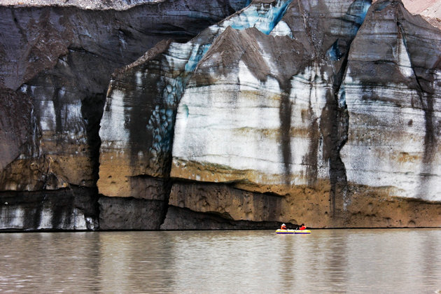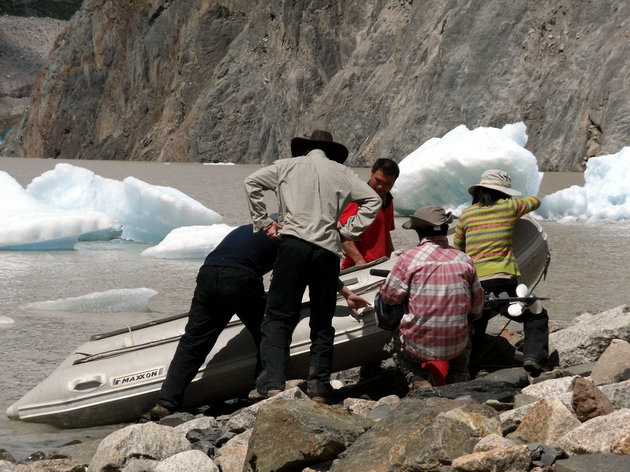 将数十公斤重的橡皮艇从几公里外营地搬运到冰湖中