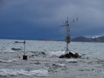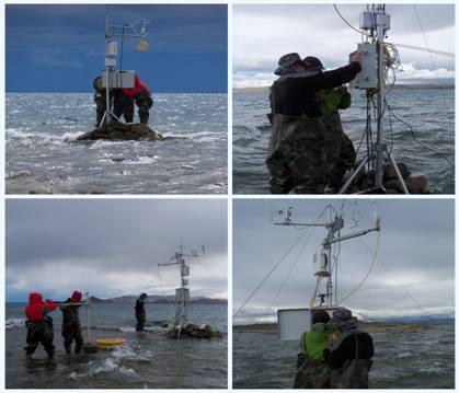 经过几天的艰苦工作,队员们克服了高原缺氧、湖上天气变化快、风大浪大的困难,7月12日终于成功地将这套涡动观测系统架在了纳木错的湖面上。该套架设在海拔4700余米纳木错湖面的观测系统为目前青藏高原主体上第一套最为全面的观测湖面与大气的辐射、能量、水交换的系统,所获取的第一手资料对于研究纳木错湖的水面蒸发、能量平衡及其在当前气候变化背景下的变化具有重要的意义。