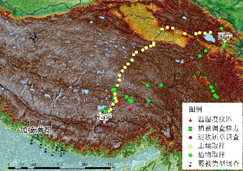 课题组织野外调查研讨会并落实的野外各阶段的任务与分工:由张镱锂研究员负责野外全面工作,刘林山负责野外设计与组织及实施工作,何永涛负责当雄站植被调查组、张华负责青藏公路沿线样品采集组、丁明军负责重大生态工程环境效应组、吴莹莹负责青藏高原农牧民生计及气候变化适应策略综合考察组、王兆锋负责青藏铁路运营对社会经济影响调查组、高俊刚负责科西河流域土地覆被类型调查,此次野外共有18位科研成员和14位聘用人员参加了外业调查工作。本简报主要介绍典型区草地退化的土壤温湿度监测和“星—机—地”航空遥感实验的植被调查野外工作进展。