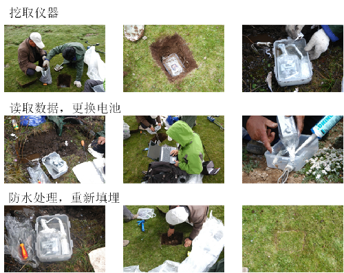 课题组于2010年在三江源地区的达日县、玛多县和杂多县,按照不同的植被类型埋设20套土壤温湿度仪器。本次野外工作的目的是检查仪器的工作状态,更换电池并采集数据。为了保障仪器在高原恶劣的环境下正常的工作,在仪器埋设前进行了密闭处理,在仪器自身密封的情况下,使用密封袋和硅胶等,对仪器采取了严格的防水措施。尽管在取出仪器的时候,发现部分仪器被地下水浸泡,甚至有少量保鲜盒进水,但是由于多道密封措施的作用,仪器未受到影响,20套仪器均工作正常。仅有1套仪器受到鼠害的影响,数据线被咬断,需在今后工作做要进一步改善,提高防鼠措施。本次野外采集土壤温室度数据20组,每组土壤温度3层、湿度3层,采集数据6.65M。