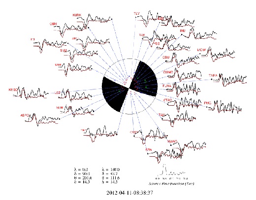 2012年4月11日,印尼苏门答腊地震发生后,我所王卫民副研究员和地质所姚振兴课题组迅速从IRIS数据中心下载了地震数据资料用于研究地震震源机制和震源破裂过程。选取其中信噪比较高并且沿方位角分布比较均匀的27个远场P波波形(震中距位于