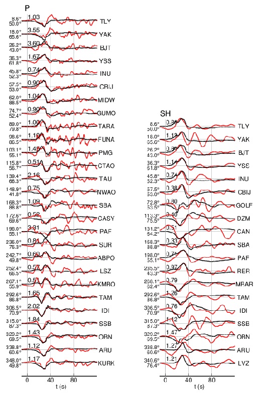 Comparison of observed (black) and synthetic waveforms (red) for P vertical components, and SH components are shown in the panel, the azimuth, epicentral distance, amplitude ratio and station name are also indicated.