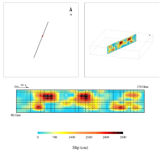 结果显示该地震断层面近直立,破裂滑动以左旋走滑为主,计算得到的地震矩为4.3×10**21Nm,Mw=8.4。最大滑动3500cm。