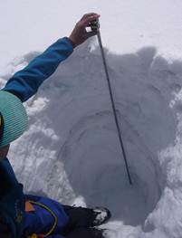 这次考察顺利的完成了以下主要观测及试验:Yala冰川物质平衡观测(图2);Yala冰川表面绝对高程和冰川边缘位置的差分GPS测量以及冰川表面高程变化的回放监测,完成了该冰川动态变化监测的重要一步(图3);Yala冰川厚度探地雷达GPR测量(图4);维护Kyanjin Gompa (3900 m)与Tarahara (119 m)两地的自动气象观测站,分别架设雨量桶,并下载气象数据(图5);沿途梯度架设持久性有机污染物(POPs)被动采样器(图6)。
