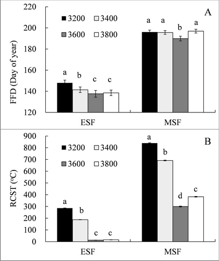 图1 早花植物(ESF)和中花植物(MSF)初花期随海拔高度变化的趋势(A),以及初花期所需要的积温变化(B)。