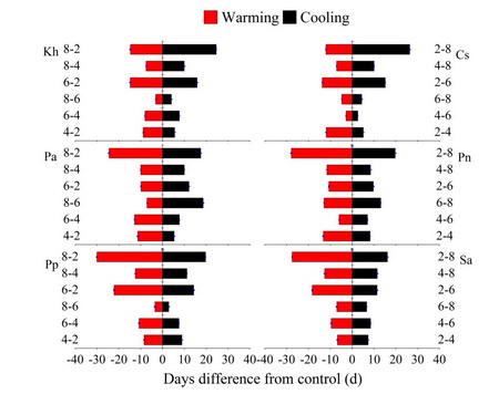 图2 不同植物初花期对增温(红色)和降温(黑色)的反应。数字表示从高海拔向低海拔或从低海拔向高海拔移栽(4个海拔高度包括3200、3400、3600和3800m)。Kh:矮嵩草;Cs:粗缘苔草;Pa:鹅绒委陵菜;Pn:雪白委陵菜;Pp:草地早熟禾;Sa:异针茅。