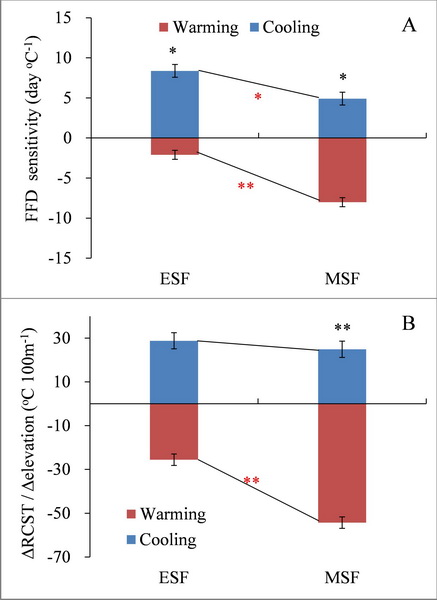 图3 早花植物(ESF)和中花植物(MSF)初花期的温度敏感性(A)及其所需要的积温随海拔的变化(B)。红色为增温,蓝色为降温。