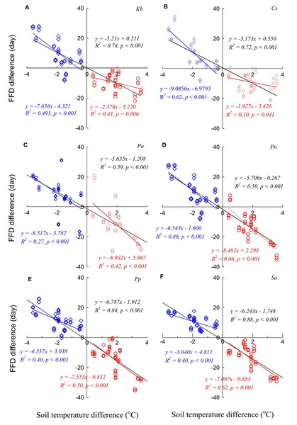 图4 不同植物初花期对增温和降温的温度敏感性。红线为增温;蓝线为降温;黑线为两者放在一起的共同效应。回归方程的斜率表示初花期变化的温度敏感性。Kh:矮嵩草;Cs:粗缘苔草;Pa:鹅绒委陵菜;Pn:雪白委陵菜;Pp:草地早熟禾;Sa:异针茅。