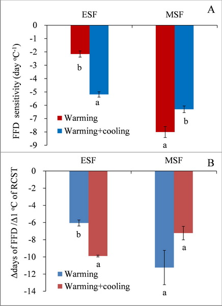 图5 利用单独增温与利用增温和降温数据分别进行分析下早花植物(ESF)和中花植物(MSF)初花期温度敏感性(A)以及每增加1℃所需要的积温初花期变化的天数(B)。红色为单独增温数据;蓝色为增温和降温数据整合在一起。