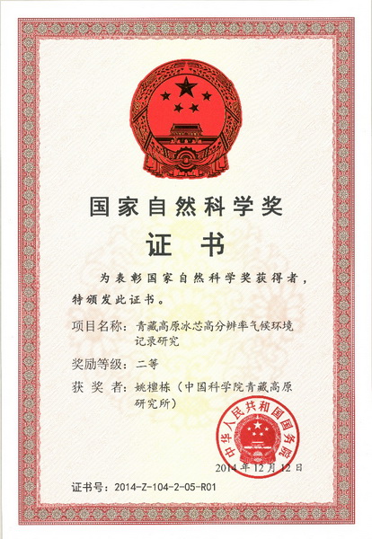 中共中央、国务院1月9日上午在北京隆重举行国家科学技术奖励大会。党和国家领导人习近平、李克强、刘云山、张高丽出席大会并为获奖代表颁奖。李克强代表党中央、国务院在大会上讲话。张高丽主持大会。 中共中央总书记、国家主席、中央军委主席习近平向获得2014年度国家最高科学技术奖的中国科学院院士、中国工程物理研究院高级科学顾问于敏颁发奖励证书,并同他热情握手,表示祝贺。习近平等党和国家领导人向获得国家自然科学奖、国家技术发明奖、国家科学技术进步奖和中华人民共和国国际科学技术合作奖的代表颁奖。 中共中央政治局常委、国务院总理李克强在讲话中代表党中央、国务院,向全体获奖人员表示热烈祝贺,向全国广大科技工作者表示崇高敬意和诚挚问候,向参与中国科技事业的外国专家表示衷心感谢。 2014年度国家科学技术奖励共授奖318项成果、8位科技专家和1个外国组织。其中,国家最高科学技术奖1人;国家自然科学奖46项,其中一等奖1项、二等奖45项;国家技术发明奖70项,其中一等奖3项、二等奖67项;国家科学技术进步奖202项,其中特等奖3项、一等奖26项、二等奖173项;授予7名外籍科学家和1个外国组织中华人民共和国国际科学技术合作奖。 我所姚檀栋院士和田立德研究员等完成的项目“青藏高原冰芯高分辨率气候环境记录研究”荣获2014年度国家自然科学奖二等奖。该项目在监测青藏高原现代降水气候意义的基础上,开展了包括12根冰芯的古气候意义与环境变化重建工作,并研究了末次间冰期以来青藏高原气候环境变化及其与周边地区的关系。该研究建立了降水稳定同位素与气温之间关系的定量模型,发现末次间冰期以来青藏高原气候存在不稳定性,也发现了冰芯微生物变化可以作为过去气候环境变化研究的新指标。研究成果提高了对青藏高原过去气候环境变化特征的认知水平,提供了未来气候环境变化情景预测的新依据,同时也促进了稳定同位素指标在其它古气候研究领域的应用。