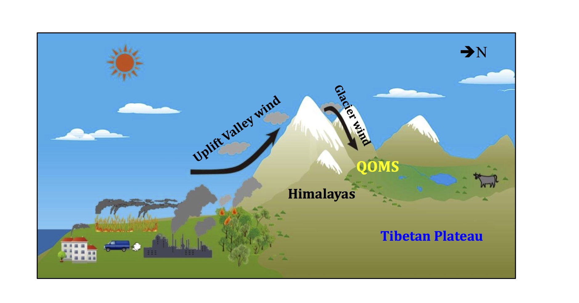 青藏高原周边广泛分布着大气污染严重区域,这些污染物可通过大气环流进入高原,与冰冻圈联系在一起,将对气候和环境产生深刻影响。中国科学院青藏高原地球科学卓越创新中心、中国科学院青藏高原研究所丛志远副研究员与合作者对该传输机制进行了深入研究,相关结果近期发表在国际知名期刊Atmospheric Chemistry and Physics和Scientific Reports上。 针对珠峰地区的大气气溶胶样品,进行了有机碳、元素碳、水溶性有机碳、离子、左旋葡聚糖和二元羧酸的较全面分析。珠峰大气气溶胶中的有机碳和元素碳浓度与喜马拉雅山脉南坡高海拔站点(Langtang和NCO-P)类似。Ca2+指示的沙尘载荷在全年保持相对稳定,但有机碳、元素碳和水溶性有机碳以及离子(NH4+、K+、NO3-和SO42-)均在春季(pre-monsoon)表现出高值,而夏季最低。珠峰大气气溶胶中的有机碳、元素碳和生物质燃烧的指示物(K+和左旋葡聚糖)具有显著的相关关系,说明生物质燃烧是春季珠峰地区高浓度碳质组分的主要原因。二元羧酸分析结果进一步提供了生物质燃烧影响的有力证据(图1)。珠峰地区大气气溶胶中二元羧酸与有机碳、元素碳的浓度变化显著相关。不同有机酸之间的比值,如丙二酸/丁二酸(di-C3/di-C4)、马来酸/富马酸(M/F)均指示珠峰地区的有机气溶胶,特别是春季的高浓度受到了生物质燃烧的直接影响,而其他因素如二次生成、光化学氧化等的贡献并不显著(Cong et al., 2015, Scientific Reports, 5:9580)。 图1 珠峰地区春季(Pre-Monsoon)大气气溶胶中二元羧酸的分子组成 根据HYSPLIT反向气团轨迹的统计结果,珠峰地区非季风期受西风急流的控制。而MODIS给出的火点分布情况(FIRMS)显示,印度北部和尼泊尔的农业秸秆焚烧和森林火灾在春季最为密集(图2)。结合气溶胶化学分析结果,说明珠峰地区在春季受到南亚生物质燃烧的跨境传输影响。 图2 MODIS卫星观测到的火点(生物质燃烧)分布状况 除了大尺度的大气环流形式外,珠峰南北坡的局地环流耦合在一起,使山谷成为污染物传输的有效通道(图3),最终导致珠峰北坡的气溶胶含量、季节变化等均与南坡高度相似。这一观点得到了金字塔站和珠峰站同步观测的气溶胶光学厚度(AOD)数据所支持;而能够显示气溶胶垂直分布的CALIOP卫星观测,也清晰表明在南亚棕色云爆发的四月份,大气污染物能够翻越喜马拉雅山脉进入高原(Cong et al., 2015, Atmospheric Chemistry and Physics 15:1573–1584)。在未来的工作中,计划在珠峰站安装臭氧仪、黑碳仪等在线观测仪器,提高数据的时间分辨率,以期更为精细刻画这一过程。 图3 喜马拉雅山脉山谷风系统对大气污染物的传输示意图 2015年4月14日,国际著名杂志Nature对此项工作以News的形式进行了专题报道。该研究工作也得到了著名大气学家、美国科学院院士V. Ramanathan教授的高度评价。他认为这是一项重要发现和进展(step forward),提供了令人信服的证据(compelling evidence)来证明喜马拉雅山脉大气污染是由于生物质燃烧产生,必须在全球范围内共同努力,尽可能多地减少其排放。 此项研究的野外工作得到了中科院珠穆朗玛峰大气与环境综合观测研究站的长期大力支持,获得了国家自然科学基金、中国科学院战略性科技先导专项资助。 论文链接: http://www.atmos-chem-phys.net/15/1573/2015/acp-15-1573-2015.html http://www.nature.com/srep/2015/150330/srep09580/full/srep09580.html Nature报道链接:http://www.nature.com/news/pollutants-waft-over-the-himalayas-1.17312 |