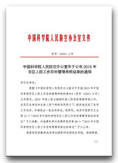 近日,中国科学院人民防空办公室开展了京区人防目标管理考核工作,对12个先进单位予以表彰,青藏高原所被授予“2015年中国科学院京区人防工作目标管理考核先进单位”荣誉称号。