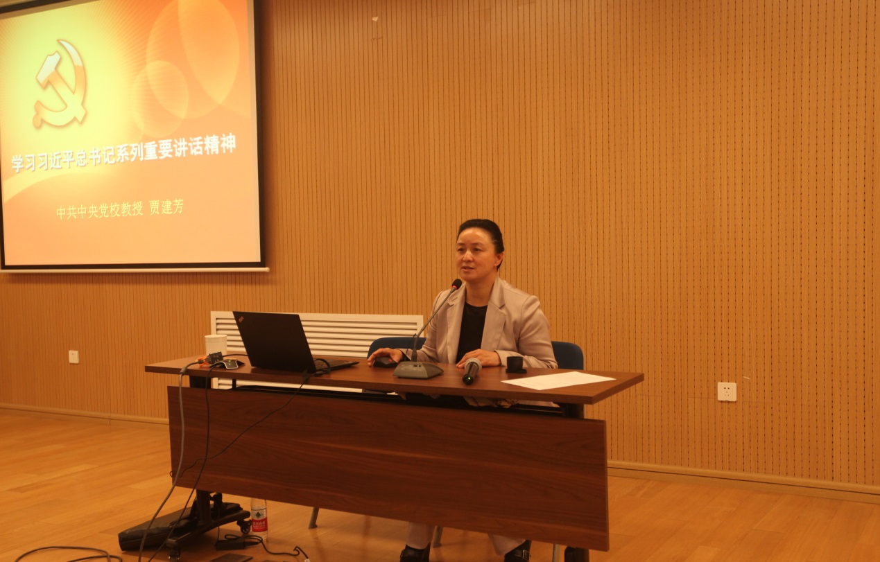 中共中央党校贾建芳教授应邀做了题为“学习习近平总书记系列重要讲话精神”专题报告。贾建芳从“定位、定标、定向、定理念、定方法、定外交、定重点、定关键”等八个方面进行了阐述。她谈到,认清历史方位是认清一切问题的基本依据;习近平提出的中国梦是历史的、现实的、未来的,是国家的、民族的、人民的,是与世界各国人民的美好愿望相通的;坚持和发展中国特色社会主义要有理论自信、道路自信、制度自信,解答了中国社会主义现代化建设的思想路线、总依据、总任务、总布局;科学发展观的理念是坚持以人为本的核心立场,对提升人、社会、国家的气质有重大意义;强烈的问题意识,就要以重大问题为导向,抓住关键问题进一步研究思考;在新形势、新定位、新理念、新道路、新要求、新状态、新目标下要坚定不移的执行中国特色的大国外交政策;要充分认识到全面深化改革的重要性和紧迫性;坚持全面从严治党是关键。