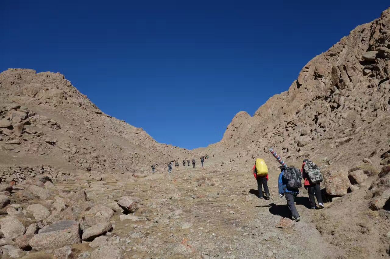 从大本营到冰川末端是长达15公里的崎岖山路,从冰川末端到冰川顶部冰芯钻取平台还有将近7公里没有探路,科考人员手上只有1987年和2002年的冰芯钻取点GPS数据。在缺少运输物资牲口的情况下,科考队员们只能通过人力向上运输科考物资。在运送物资的同时,徐柏青研究员首先带领一批科考人员到冰川上探路并选择冰芯钻取点。 18日,在科考人员们的艰辛努力下,数吨重的冰芯钻机等仪器设备、燃料、高山生活用品、食品等科考物资尽数安全运送到冰川末端海拔4920米的前进营地。21日,冰芯钻机、高山帐篷、食品和燃油等打钻物资全部送达海拔5320米的冰芯钻取点。