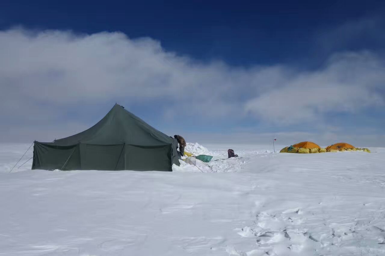 随着冰芯钻取工作的开展,科考人员们将精力腾挪出来开展一些其他方面的科学考察工作。高山自动气象站架设、布设冰川物质平衡测杆、采集表雪和雪坑样品、往下运输冰芯、采集岩石表层10Be样品等工作项目有条不紊的进行着。然而冰川表面的风雪一天天加大,气温也一天天降低。前往打钻点运输冰芯的科考队员们每天穿梭在风雪之中:早上从冰川末端出发还是艳阳高照,但往上走了不到一半路程天气开始变坏,乌云从冰川西北部黑压压的侵袭过来,霎时狂风肆掠,挟带着冰冷的雪粒呼啸而过,打在脸上犹如针刺。偶尔阵风袭来,能见度瞬时降低到不足10米,科考队员们只能选择蜷缩着身子一点点往前挪。到达打钻点后,所有人都冻得直打哆嗦,呼吸产生的水汽也在防护面罩上结上了一层厚厚的冰霜。在打钻点稍事休息之后,队员们用背包将冰芯包裹好,装在雪斗上向前进营地运输。运输至前进营地的冰芯用积雪覆盖储藏在冰川末端,然后再由人工往下运输至大本营冷冻保存。