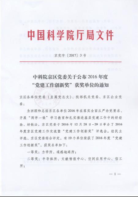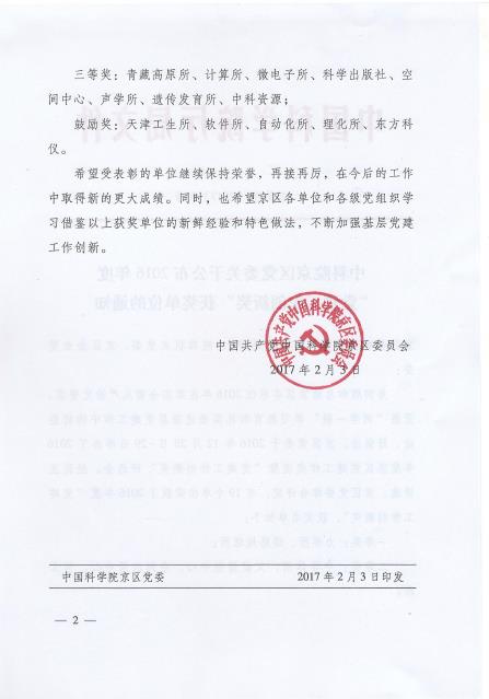 青藏高原所获得2016年度“党建创新奖”三等奖