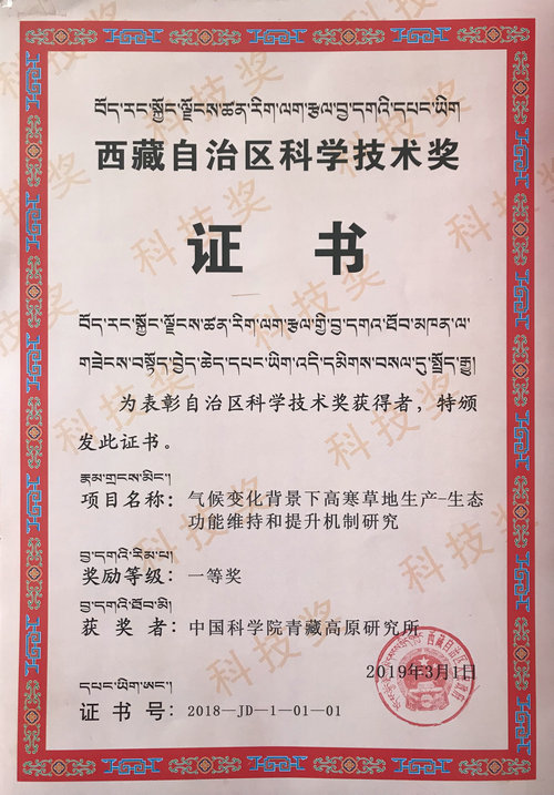 由中国科学院青藏高原研究所、中国科学院青藏高原地球科学卓越创新中心汪诗平研究员牵头,联合中国科学院地理科学与资源研究所、西藏农牧学院、西藏自治区那曲地区农牧局、西藏自治区农牧科学院草业科学研究所和西藏大学等6家单位的20名科研人员完成的关于“气候变化背景下高寒草地生产-生态功能维持和提升机制研究”项目荣获2018年度西藏自治区科学技术奖一等奖。中国科学院青藏高原研究所为第一获奖单位。