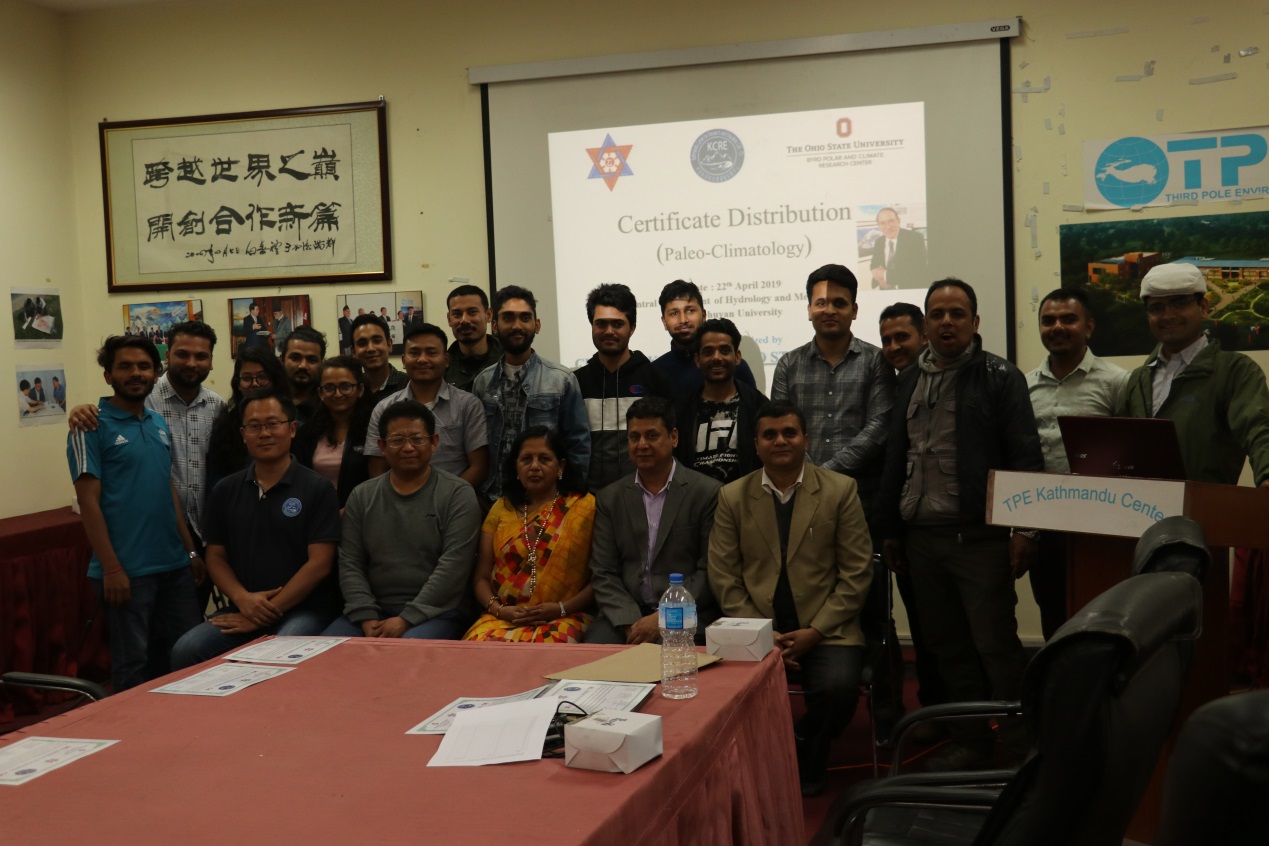古气候学(paleoclimatology)由美国科学院院士、中国科学院外籍院士、美国俄亥俄州立大学杰出教授、伯德极地研究中心研究员Lonnie Thompson讲授。该课程2009年首次在中国科学院青藏高原研究所通过远程网络视频技术开设实时空中课堂,2019年首次在尼泊尔中国科学院加德满都科教中心(以下简称“加德满都中心”)开设空中课堂。 通过12周24次的课堂讲授,Thompson教授系统地概述地球气候变化的历史记录、驱动因素和机制,以及对气候与人类社会的相互影响,并详细介绍冰芯、树轮、湖泊和海洋沉积物、文献记录等多种介质在古气候重建中的应用。对开阔学生的研究视野起到了积极的推动作用。 课程从2019年1月8日开始,历时3个月,24名特里布文大学学生参加了此次培训,4月22日加德满都中心举办结课证书颁发仪式,特里布文大学主管教育副校长Sudha Tripathi、水文气象系主任Deepak Aryal、加德满都中心副主任刘晓波、Binod Dawadi、主管徐田利出席仪式。 特里布文大学副校长Sudha Tripathi表示,此次课程深化基础知识,开拓科学视野,深受尼方学生欢迎并希望以后能更多地开展类似的课程,促进尼中青年学者与其他国际学者进行学术交流。
