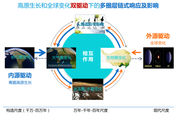 该项目以21世纪能够引领地球科学实现新突破的地球系统科学研究为核心,以地球六大圈层(岩石圈、水圈、冰冻圈、大气圈、生物圈和人类圈)相互作用最为典型和最为强烈的青藏高原为试验场,瞄准高原生长与全球变化双驱动下的多圈层链式响应及影响这一核心科学问题(图1),布局大陆碰撞-俯冲与高原生长影响、西风-季风协同作用与冰冻圈和水循环、高寒生态与人类适应三大研究方向,开展多学科交叉融合研究,并通过综合集成发展青藏高原地球系统模式,打通时间隧道、打通圈层隔离、打通空间局限、打通学科界线,重建关键节点高原古高度与气候-生物-地表的链式响应过程(图2),揭示现代地表圈层相互作用过程及机理,阐明人类适应高原环境的历史与机理。