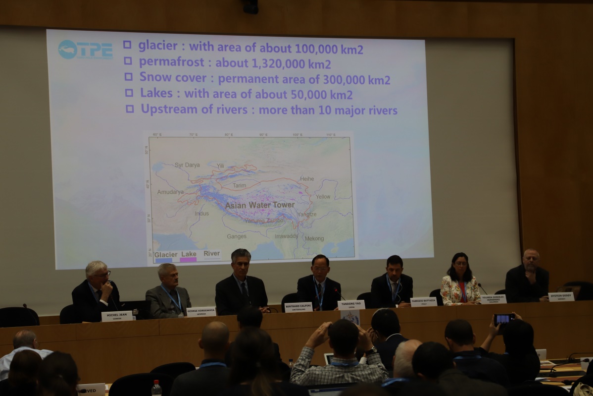 TPE和WMO-GCW联合在峰会举办了主题为“Roadmap to integrated mountain cryosphere observation and information system”的边会,由TPE联合主席姚檀栋院士和GCW主席、WMO冰岛常驻代表 Arni Snorrason共同主持,边会吸引了60余名国际与会专家参加。WMO助理秘书长张文建指出,此次分会是TPE 与WMO/GCW 加强合作的里程碑事件。此次边会分为三部分,第一部分探讨了冰冻圈观测与监控/预测的联系,第二部分探讨了建立冰冻圈综合信息体系,第三部分为全体讨论。在第一部分的讨论中,瑞典哥德堡大学教授、TPE执行委员会委员陈德亮院士强调了高山观测对山区集成预测的重要性,俄亥俄州立大学教授、TPE 联合主席Lonnie Thompson院士从全球视角分析了低纬度冰川的演变情况,圣安德鲁斯大学Owen King介绍了依托泛第三极环境专项开展的第三极地区冰川时间变化研究,中科院青藏高原研究所张凡研究员介绍了第三极水文观测研究进展,尼泊尔特里布文大学Deepak Aryal教授介绍了在极端海拔条件下利用自动气象站开展的相关研究,美国爱达荷大学Vladimir Aizen教授介绍了中亚地区冰川观测研究,GCW代表C.Fierz介绍了GCW的观测工作。在第二部分的讨论中,中科院青藏高原研究所李新研究员介绍了TPE和青藏所的大数据工作及平台,GCW 的Oystein Godoy博士介绍了GCW的数据门户及管理原则, Mathias Bavay博士介绍了GCWDE 数据的互操作及标准化工作。经全体讨论,边会一致认为应当推动高山地区观测模拟工作一体化,合作建立全球冰冻圈信息体系,提供稳定和大尺度的冰冻圈数据。