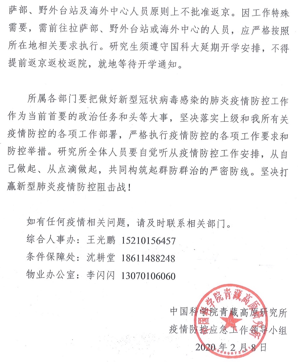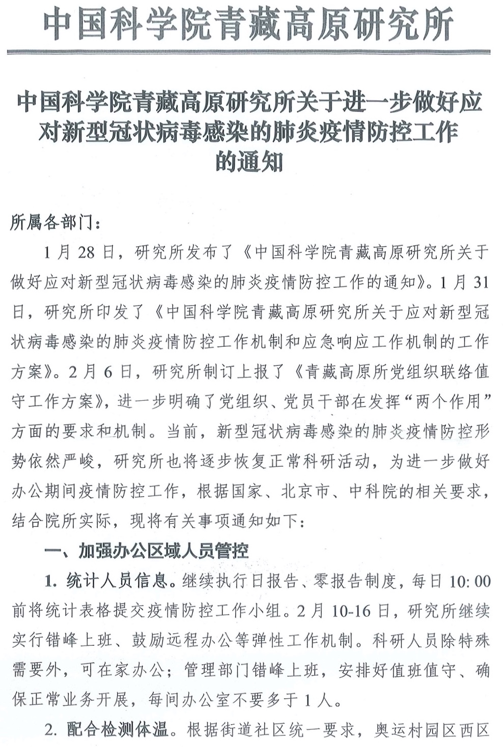 青藏高原所关于进一步做好应对新型冠状病毒感染的肺炎疫情防控工作的通知