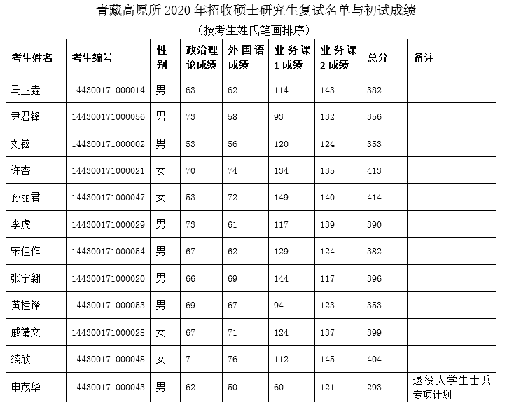 按照北京市招考委、国科大招办以及《青藏高原所2020年度硕士研究生复试工作实施细则》的有关文件要求,青藏高原所依据划定的初试合格分数线,结合2020年度招生指标、上线生源数和复试差额比例要求等情况,现将2020年招收硕士研究生复试名单(第一志愿考生)公布如下: