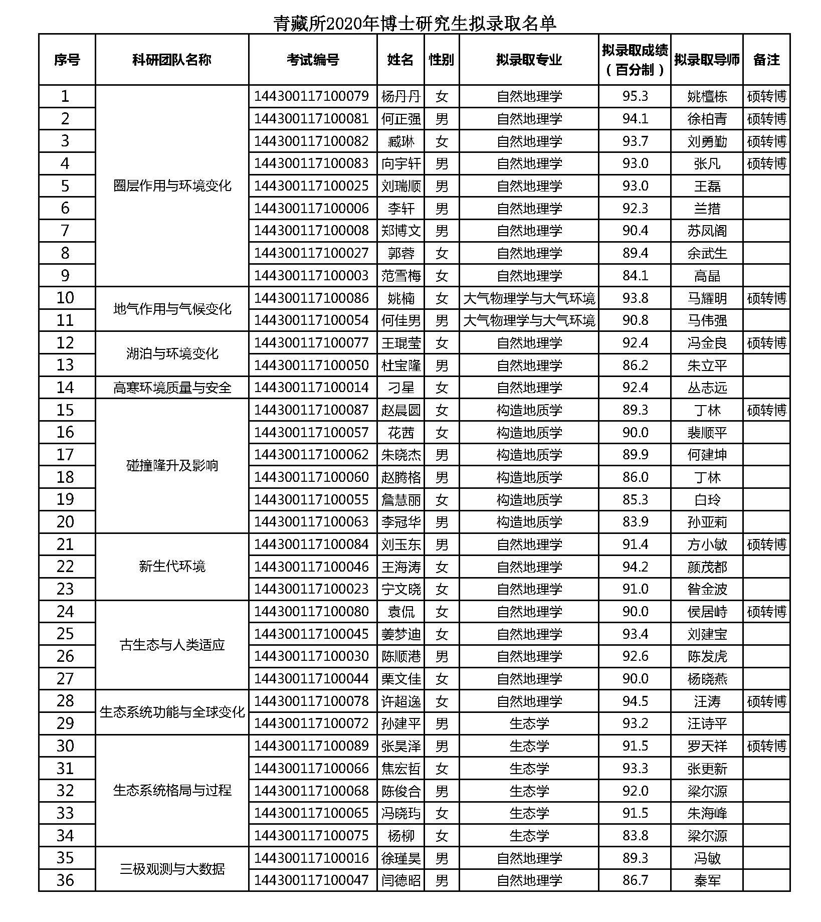 根据教育部、中科院大学有关文件精神,青藏高原所招考工作始终坚持“按需招生、全面衡量、择优录取、宁缺毋滥”和“公开、公平、公正”的原则,2020年博士研究生以“申请-考核制”形式开展工作。根据青藏高原所2020年博士研究生招考工作实施细则,经过研究团队初试审核和研究所复试工作小组考核,此次拟录取博士统考生36名(少数民族骨干计划考生另行通知)。拟录取名单在青藏高原所网主页-研究生教育-招生管理-博士招生的专栏进行公示,公示时间为10个工作日。公示期间联系方式如下:
