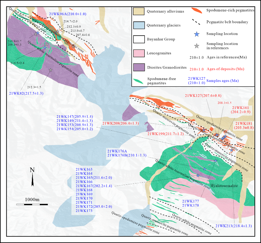 综合前人和本次的年代学结果显示,白龙山岩浆—成矿事件集中于晚三叠世至早侏罗世早期:闪长岩形成于218–210Ma,花岗闪长岩形成于212–205Ma,淡色花岗岩形成于215–196Ma;富锂辉石伟晶岩形成于约214–195Ma,无锂辉石伟晶岩形成于218–196Ma(图2)。结果表明,含矿和不含矿伟晶岩与不同岩性的侵入体在形成时代几乎重合。