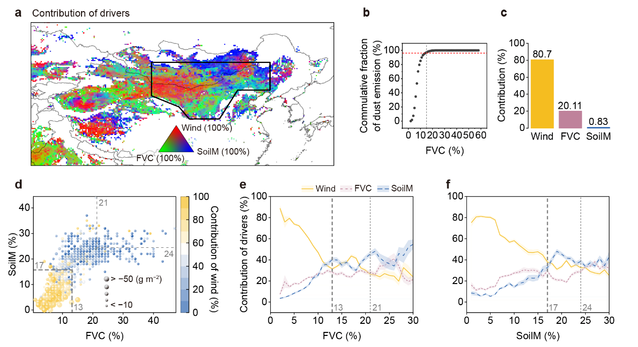 针对这一问题,本研究以蒙古高原及其周边戈壁—荒漠区等沙尘源地为主要研究区域,整合物理沙尘排放模型、多源长期观测数据(1982–2023)以及CMIP6未来情景模拟(2015–2100),构建了区分时间尺度的分析框架。通过多组模型控制实验和统计归因分析,科研人员发现:在年际尺度上,沙尘活动主要受地表风速及其相关的大尺度气候模态(如ENSOAOPDO)控制;而在多年到年代际尺度上,植被变化成为主导因素。自2000年以来,沙尘源区植被持续增绿使沙尘排放累计减少约32.5%,且在未来气候情景下,这一减沙效应仍将持续增强。相比之下,在固定植被、不考虑增绿的对照实验中,沙尘排放将维持高值甚至呈上升趋势,表明植被增绿是长期沙尘减弱不可替代的关键驱动。沙尘减排主要集中在植被覆盖度低于约15%的稀疏植被区,这些区域贡献了绝大部分沙尘排放。