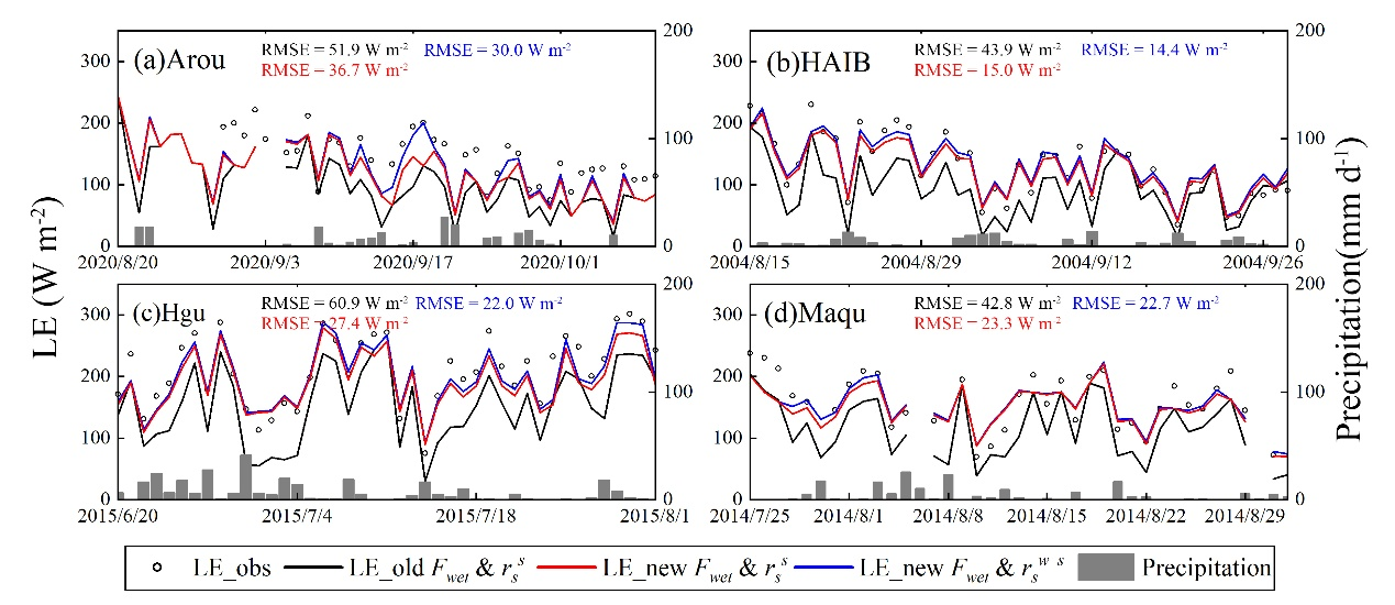 图1 基于改进前后湿表面组分(Fwet)及表面阻抗(改进前土壤表面阻抗:rss;改进后土壤表面阻抗:rsw_s)估算的日蒸散发值对比。黑色、红色和蓝色的RMSE值分别对应湿表面组分和土壤表面阻抗均未改进、湿表面组分改进后、湿表面组分和土壤表面阻抗均改进后的计算偏差