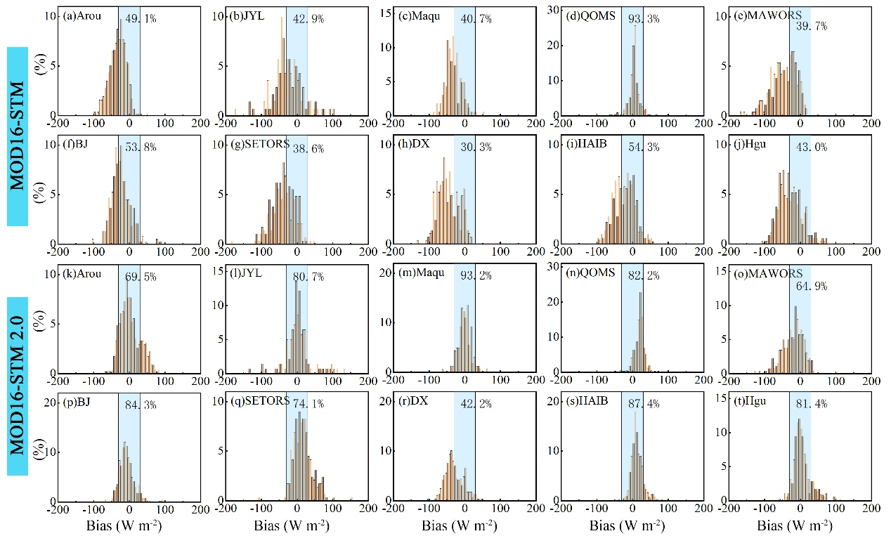 图3 两种模型模拟偏差的直方图。蓝色阴影区域表示偏差值介于-30至30Wm⁻²之间,面板数值代表该范围内的百分比占比