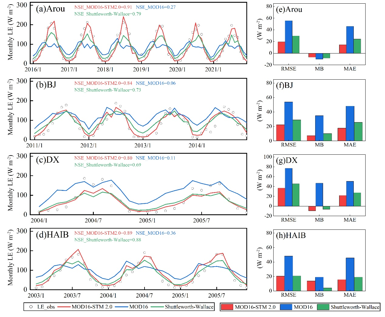 图4 MOD16-STM 2.0、MOD16和Shuttleworth-Wallace模型模拟的蒸散发时间序列与四个观测站点实测数据的对比(a-d)。图板(e-h)展示了各模型的误差对比结果