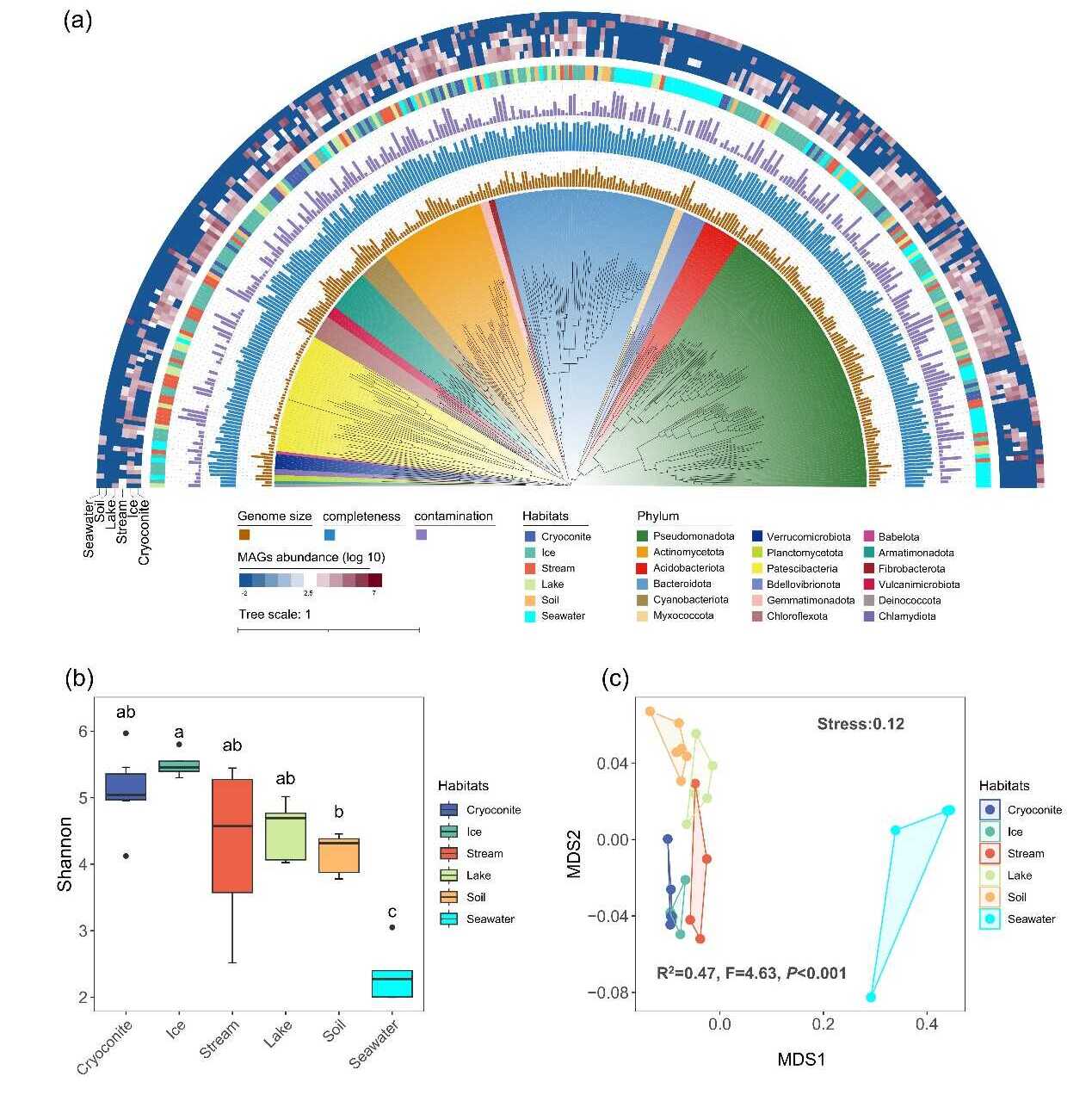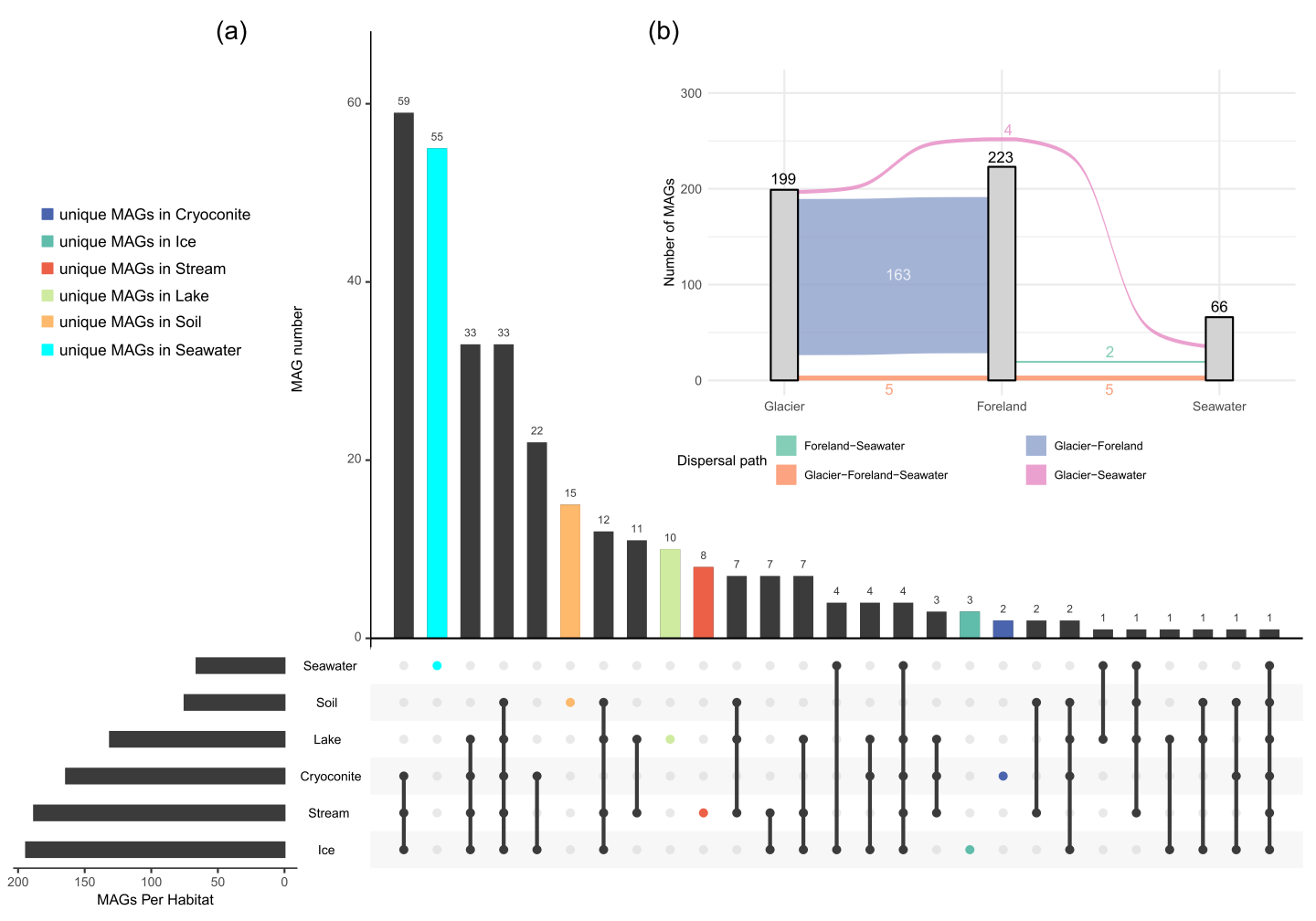 图3 细菌MAGs在不同生境中的分布。(a)冰尘、冰、溪流、湖泊、土壤及峡湾生境中共有和独有的MAGs数量。(b)追踪源自冰川及冰川前缘的MAGs向下游生境的扩散路径