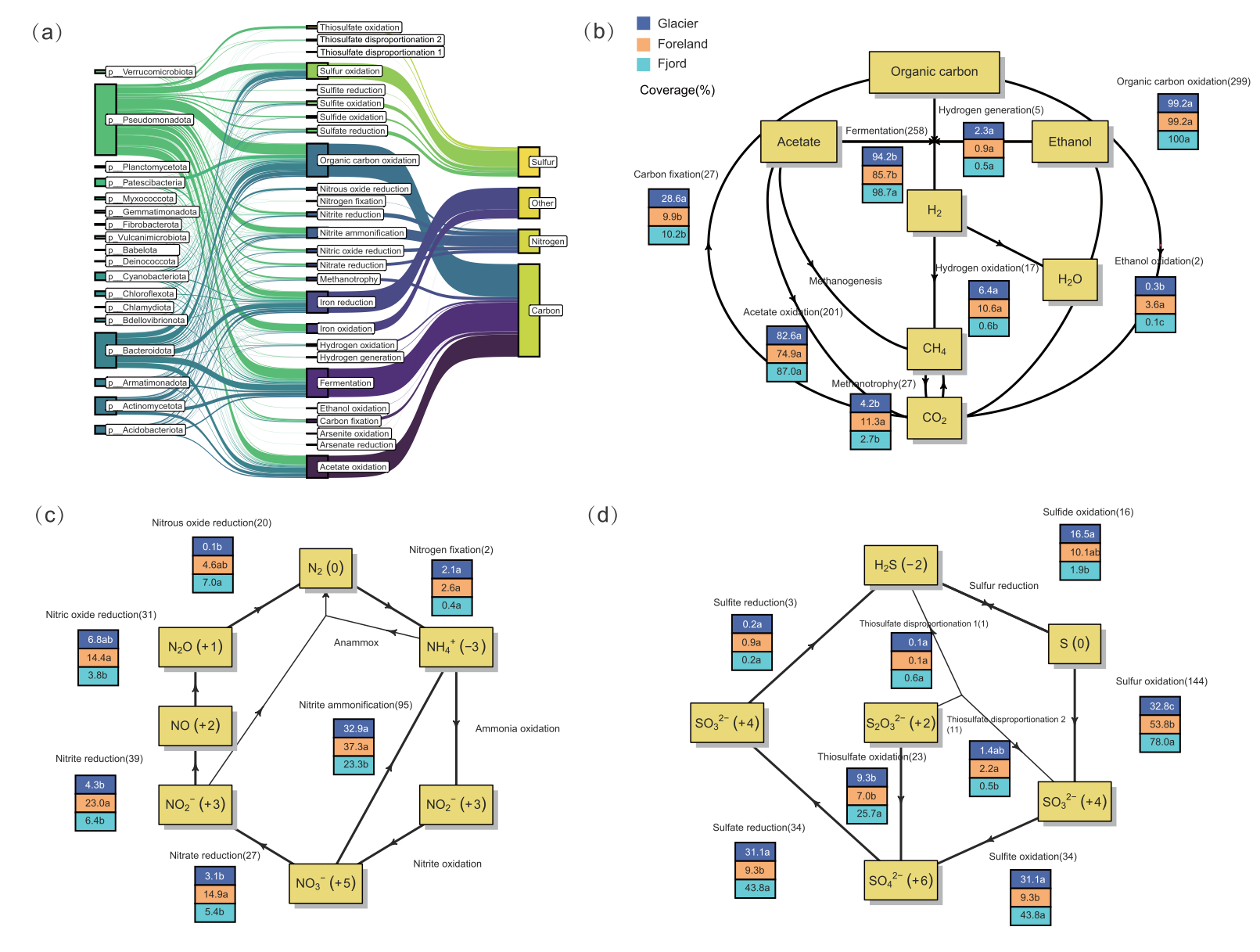 研究团队利用宏基因组学技术,构建了309个高质量的微生物基因组,系统追踪了微生物从冰川到海洋的传播路径(图2)。结果发现,冰川微生物在前缘土壤中占据主导地位(占75%),但在峡湾沉积物中仅占14%,而峡湾中83%的微生物为本地特有(图3)。这表明,尽管冰川是下游生态系统的重要微生物“种子库”,但陆-海交界处的环境过滤作用极为强烈,绝大多数冰川微生物无法适应海洋环境。冰川不仅是冰冻的储水库,更是活跃的生物反应器和微生物基因库(图4)。研究发现,冰川和前缘生态系统中微生物的代谢功能高度多样,尤其是在氮循环方面,前缘是反硝化作用的热点区域;而峡湾则以硫氧化过程为主,显示出截然不同的生物地球化学特征。基因层面的分析进一步揭示,冰川微生物拥有更丰富的冷适应基因和复杂碳降解酶基因,体现了其对极端环境的独特适应策略。