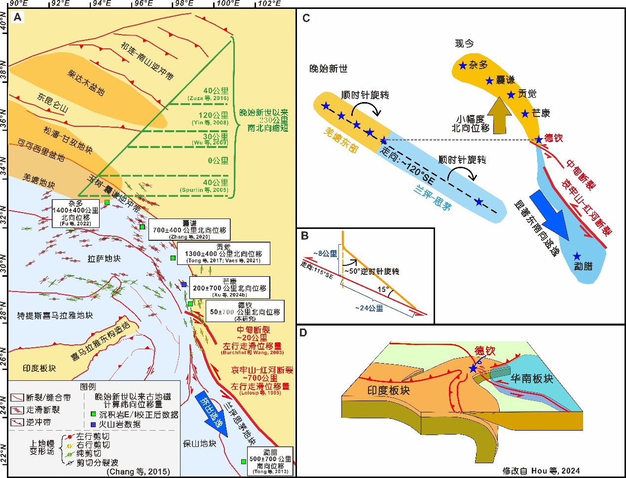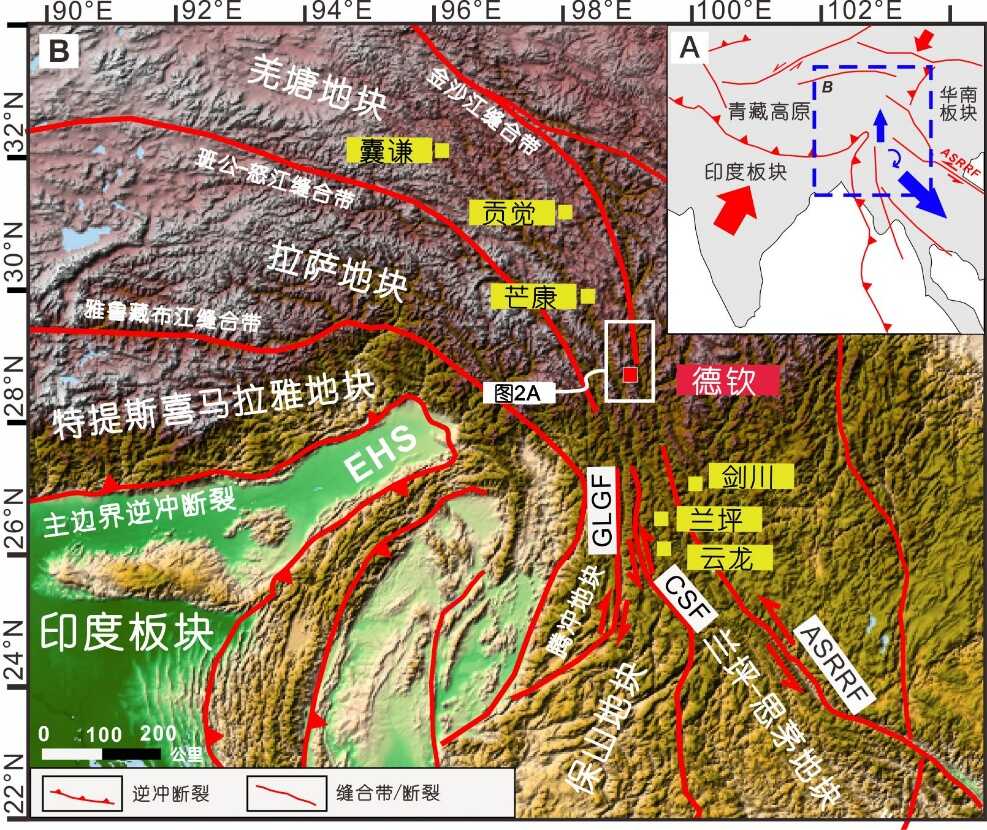 作为新生代印度-欧亚大陆碰撞的构造响应,青藏高原东南缘自晚始新世以来普遍被认为经历了显著的顺时针旋转和东南向挤出逃逸。然而,近年来的古地磁研究揭示,高原东南缘的构造响应存在显著的南北差异:东南向逃逸可能仅发生在南部(如兰坪-思茅盆地),而北部(如羌塘地块东部)可能存在北向运动。目前,关于北部北向运动的幅度、起始时限、其与南部东南向逃逸的动力学耦合关系,尤其是控制这种南北向反向运动的构造边界位置,尚不清楚。
