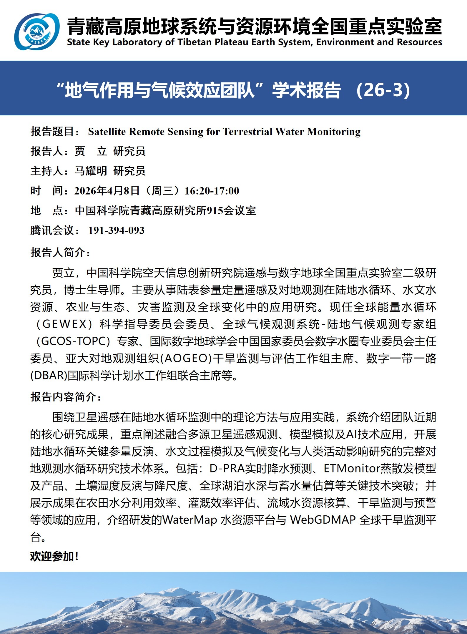 报告题目:Satellite Remote Sensing for Terrestrial Water Monitoring